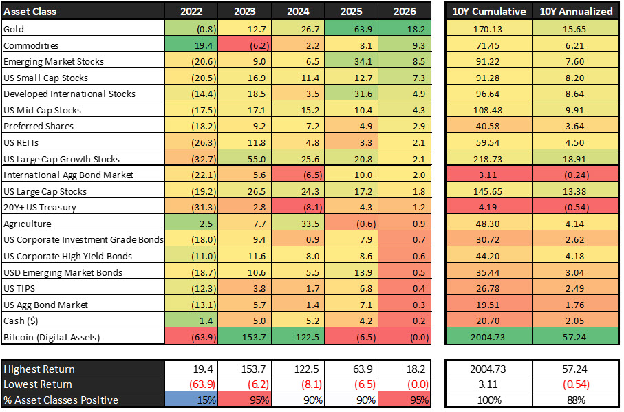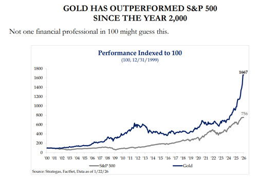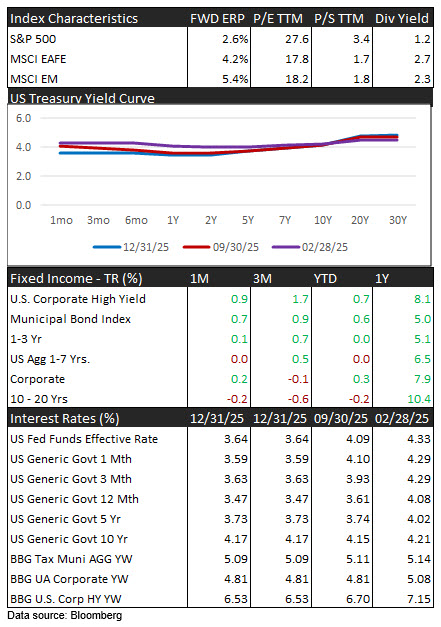 U.S. equities began 2026 with strong momentum, supported by broadening market leadership, rising earnings expectations, favorable macro conditions, and early signs of sector rotation away from overconcentrated mega-cap technology. Looking back over the last year Gold once again led performance, significantly outperforming equities and fixed income, while emerging markets and international equities posted solid gains. U.S. sector leadership remained narrow in 2025, focused mainly on Communication Services, Technology, and Industrials, while defensive sectors lagged—highlighting the importance of a selective investment positioning.