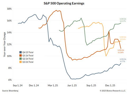 Earnings expectations are continuing to strengthen into 2026–27. Revenue forecasts for major retailers are increasing, Q4 earnings estimates are rising (now +8.8%), and early 2026 earnings predictions are above 10%. Analysts’ upward revisions remain widespread, while guidance trends are positive, and cost pressures are easing due to disinflation in oil, shelter, and wages. This combination positions corporate margins for ongoing growth.