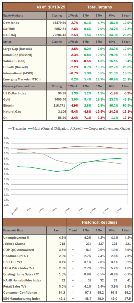 Markets declined broadly this week. The S&P 500 dropped 2.41%, the Nasdaq declined 2.53%, and small caps underperformed with the Russell 2000 down 2.87%. International equities were mixed, with MSCI EM up 0.16% and MSCI Asia Pacific gaining 0.31%. Sector performance was weak overall, led by declines in Energy (–3.98%), Consumer Discretionary (–3.32%), and Real Estate (–3.29%). Commodities were volatile: silver surged 14.6%, gold increased 10.2%, while oil and natural gas fell by more than 4%. Bitcoin decreased nearly 5%. Fixed income returns were flat to slightly negative.