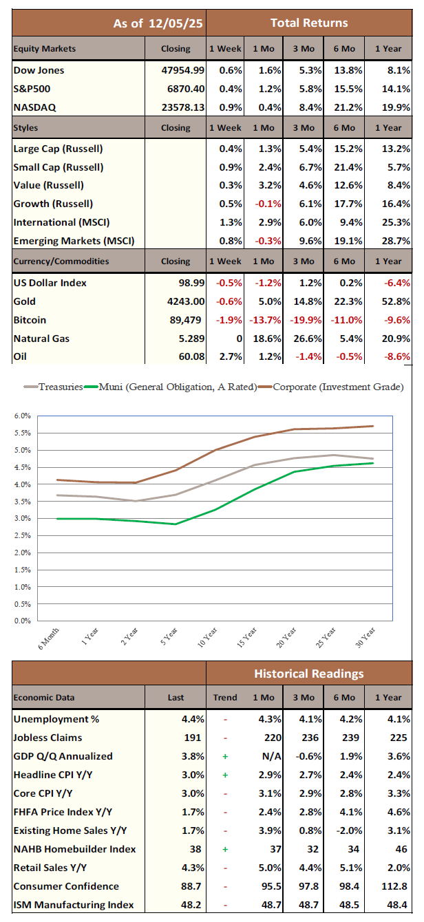 Global equities posted modest gains this week, with the S&P 500, Nasdaq, and Dow Jones Industrial Average rising. Small caps outperformed large caps, and international markets were mixed but still positive. Sector performance was uneven: Energy led, while Healthcare and Utilities declined. Commodities generally strengthened, led by natural gas and silver, while Bitcoin dipped, continuing its recent weakness.