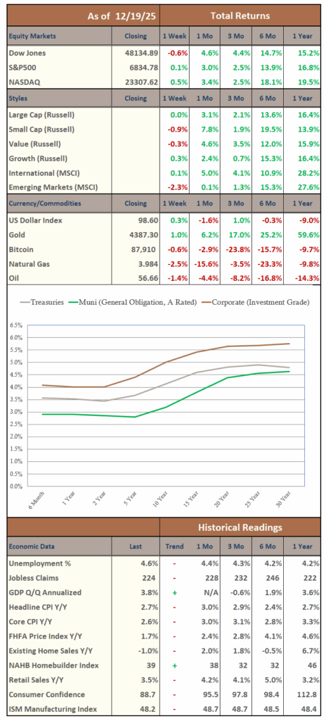 Global equities were mixed this week, with the S&P and NASDAQ rising slightly, while the Dow declined. Small caps underperformed. International markets didn’t fare much better, as MSCI EAFE was essentially flat and MSCI Emerging Markets declined. Sector performance varied: Consumer Discretionary led, while Energy dropped sharply. Commodities experienced volatility, with silver jumping around 8% and gold increasing about 1%; meanwhile, oil and natural gas fell.