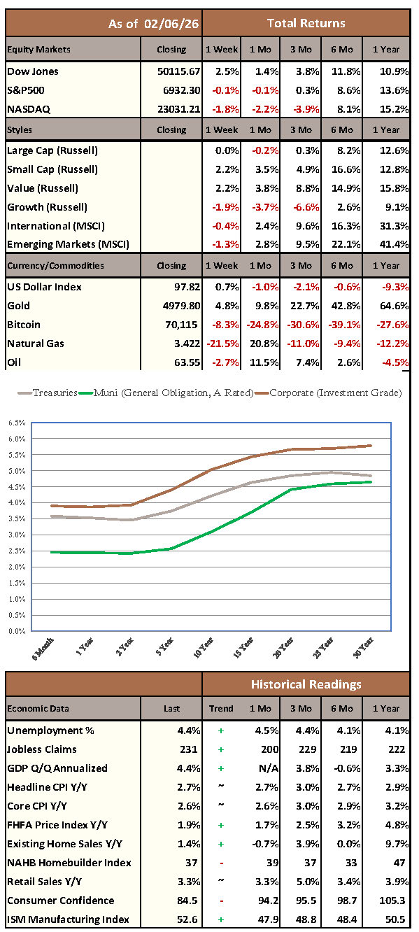 Markets closed on a cautious note. Investors favored dividends, value stocks, and small caps, while growth and high-beta stocks underperformed. Leading sectors included staples, energy, and industrials. Technology and consumer discretionary sectors lagged, as weaknesses in software impacted the benchmarks. Outside the U.S., performance was mixed, with developed markets more stable than emerging markets. Core bonds gained slightly, and credit remained steady. Commodities stayed volatile, with notable swings in precious metals and energy; finally, Bitcoin and listed private equity strategies underperformed.