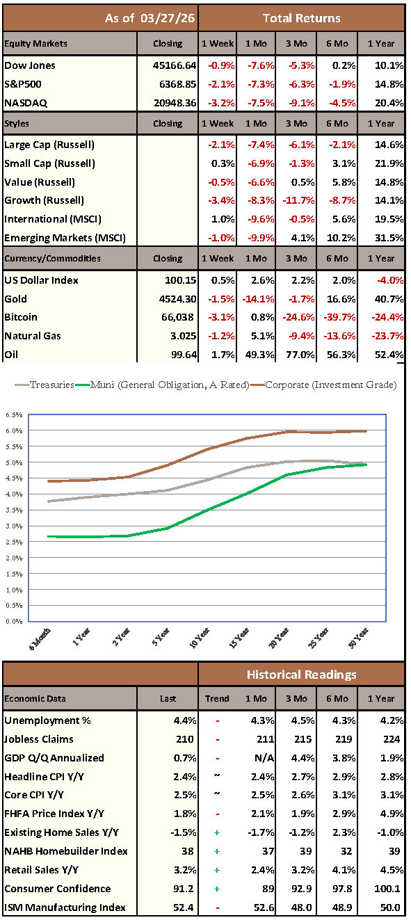 Markets steadied as investors navigated war driven volatility, with risk appetite remaining selective. Small caps outperformed following recent weakness, while large caps were mixed. Energy led on ongoing supply concerns, while Technology and Communications lagged amid rate sensitivity. Utilities and Consumer Staples held up better as defensives. International equities showed relative strength versus the U.S. In fixed income, shorter maturities were steadier than the long end as yields stayed elevated and credit conditions remained stable. Commodities were mixed, with firm crude offset by weaker precious metals. Alternatives diverged, as midstream assets strengthened and listed private equity softened.